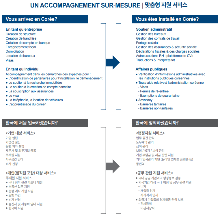 Dans l’optique d’effacer les obstacles à l’implantation et de favoriser la mise en place de synergies entre France et Corée, la Chambre de Commerce et d’Industrie franco-coréenne propose en effet ses services corporate. Destinée à soutenir les structures en passe de faire leurs premiers pas ou de se développer au Pays du matin calme, cette aide sur-mesure convient aux expatriés comme aux entreprises, en amont comme en aval de l’arrivée en Corée. Elle répond à des problématiques aussi diverses que la création de structures, les obligations professionnelles spécifiques à la Corée (assurances, licences, etc.), l’obtention de visas et d’exemptions de quarantaine, la stratégie marketing, ou l’apprentissage du coréen pour les salariés.