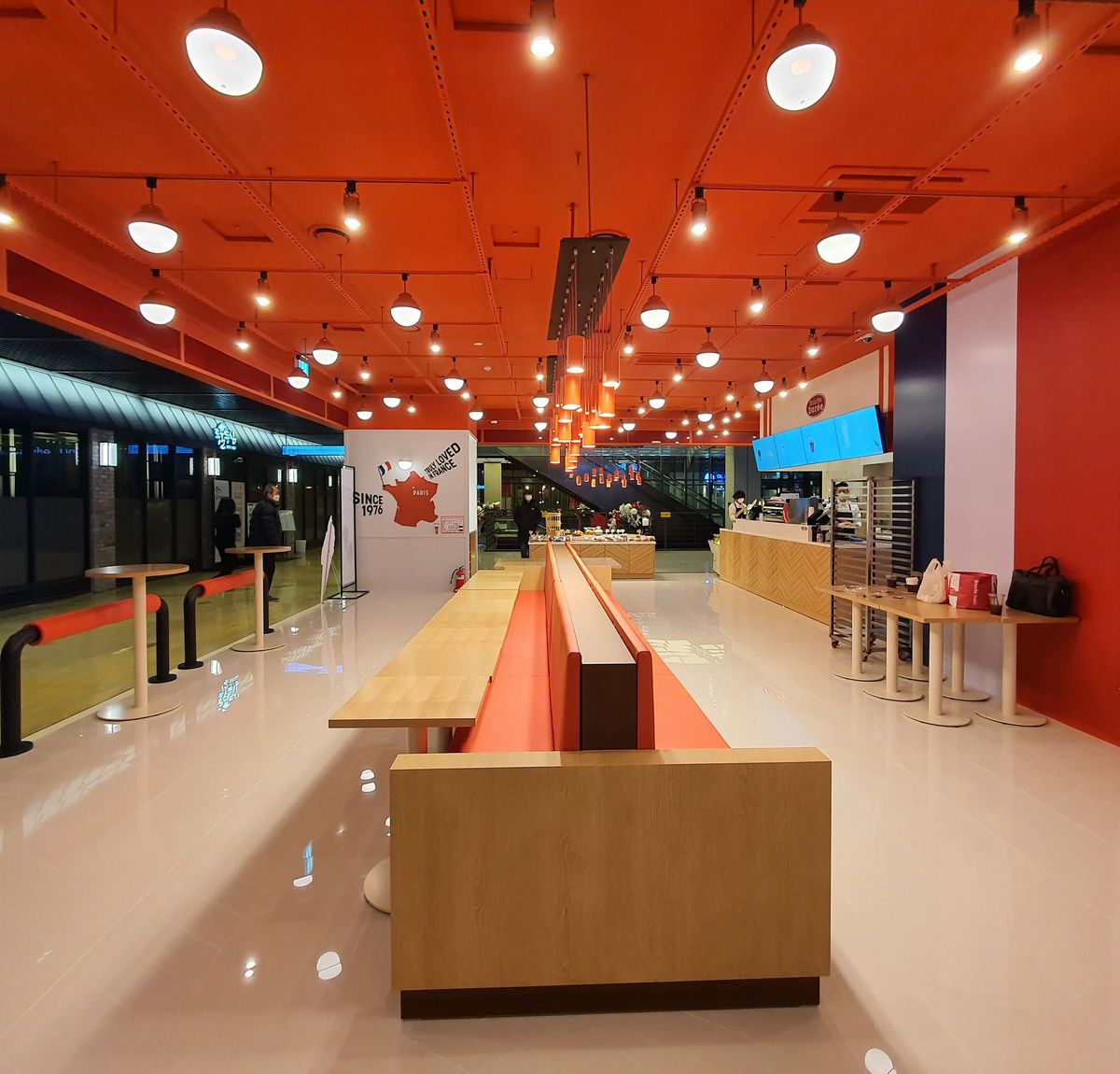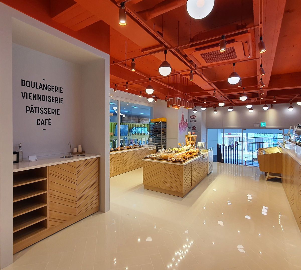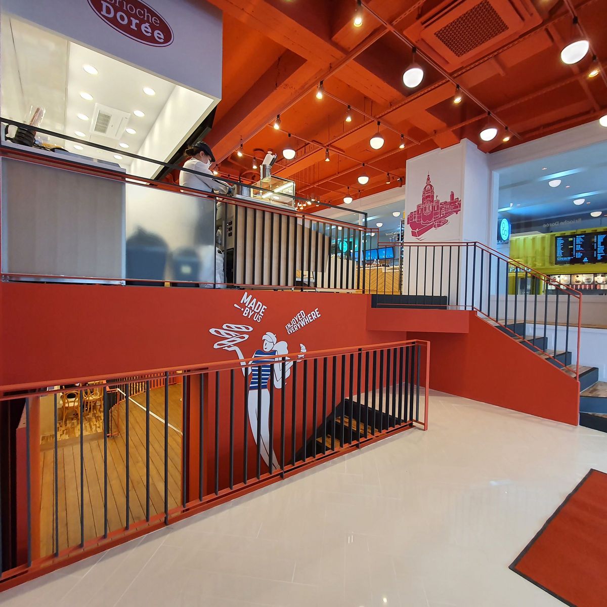 A Jeondong, l’enseigne propose à ses clients une toute nouvelle expérience dans un univers plus moderne et contemporain qui souligne ses origines françaises. Le client est immergé dans une ambiance inspirée des traditionnels bistrots parisiens, avec une toute nouvelle configuration de restaurant comprenant une cuisine ouverte pour permettre aux clients d’assister à la production instantanée de l’offre Brioche Dorée. Le nouvel espace ne propose pas moins de 95 places assises aux couleurs de l’enseigne et de ses fresques murales représentatives des grandes villes et monuments français !