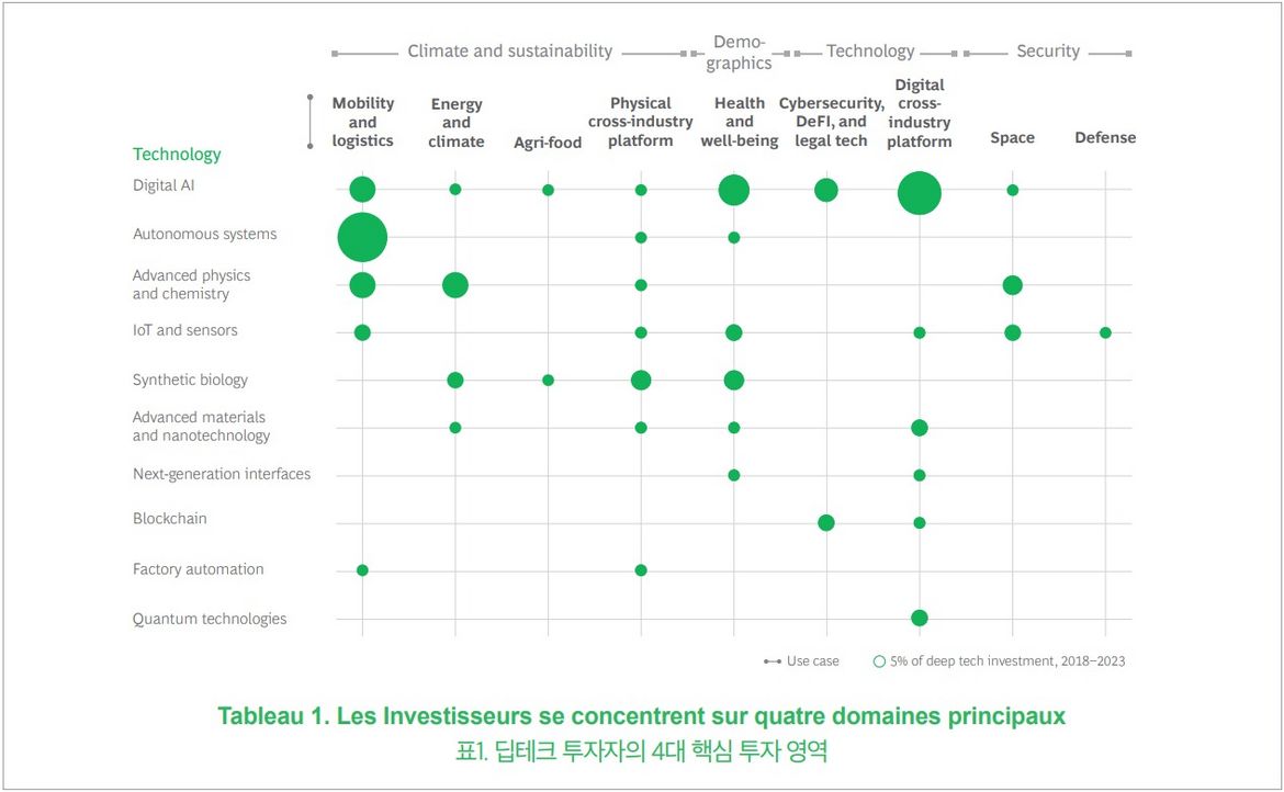 BCG a analysé les investissements deep tech le long de deux axes - les technologies et les cas d'utilisation - dans les quatre domaines d'impact mentionnés précédemment. Plusieurs technologies et cas d'utilisation attirent des parts importantes du marché, tandis que les plates-formes intersectorielles sont également populaires.