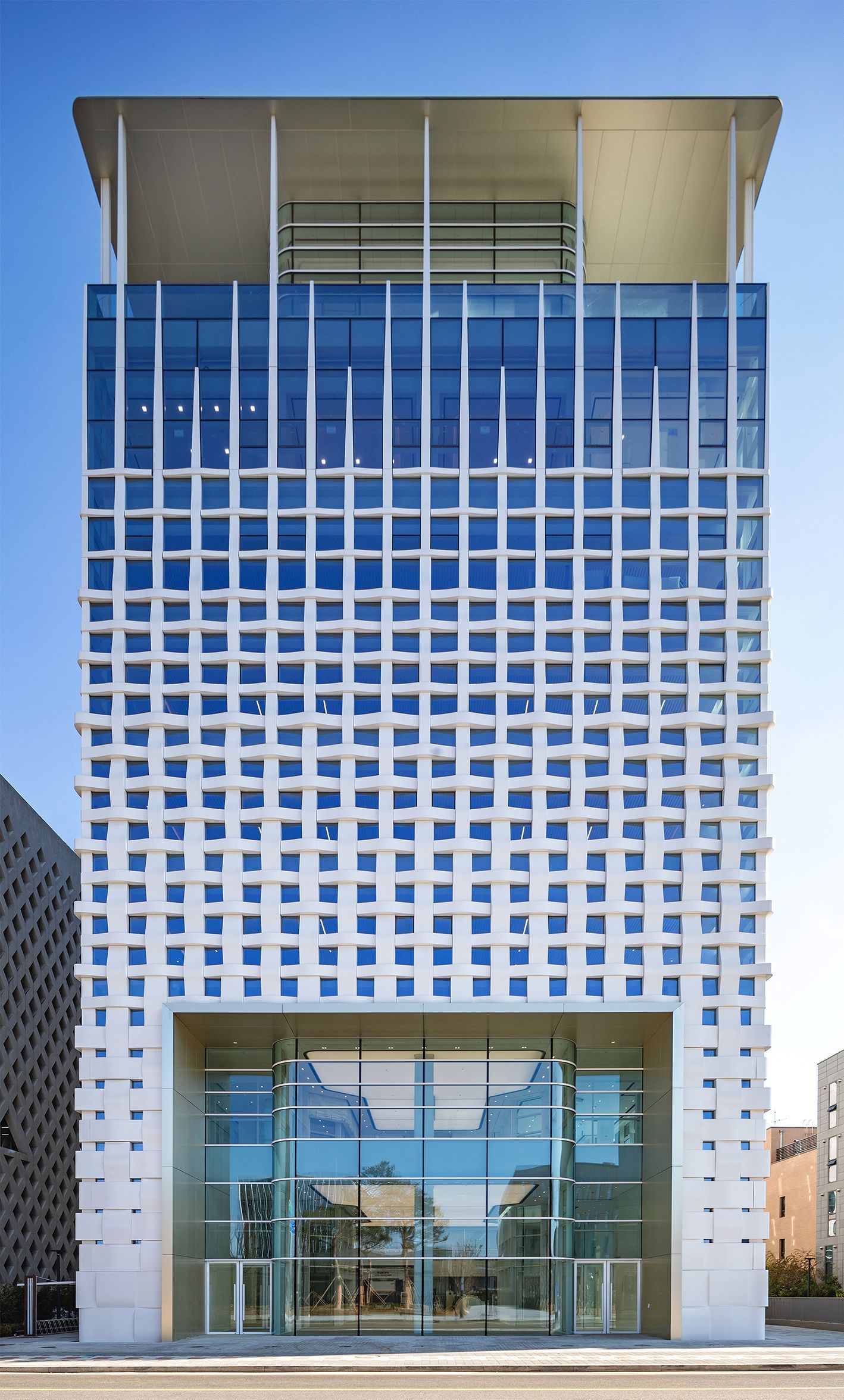 Ces deux organisations ont reconnu le design innovant et remarquable du projet qui combine les possibilités des matériaux composites avec l’expression de l’identité propre au client lui-même producteur de ces matériaux. En effet, les textures progressives de la façade qui expriment le processus du tissage sont réalisées en panneaux de GFRP (Glass Fiber Reinforced Plastic) et les auvents d’entrée et du toit sont réalisés en panneaux d’aluminium anodisé renforcés par une structure en nid d’abeille. Reconnaissant la parfaite interaction entre l’architecte David-Pierre Jalicon (DPJ&Partners, Architecture) et la directrice de la création de Hankuk Carbon Mme Victoria Cho, ils ont été désignés co-lauréats.