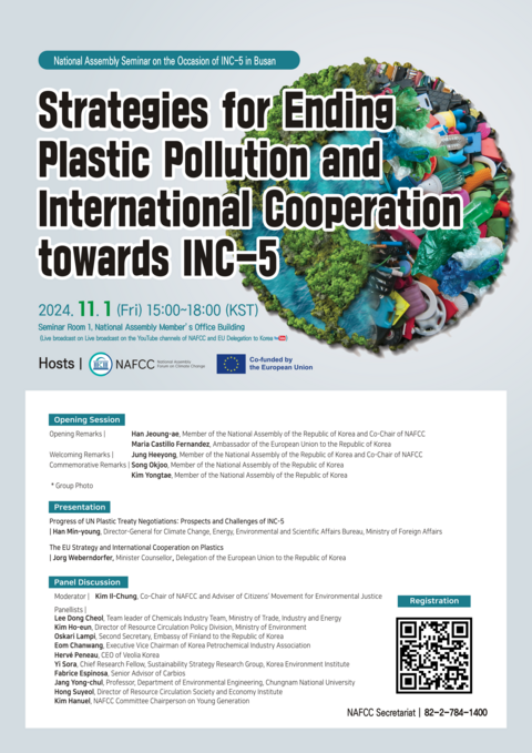 The National Assembly Forum on Climate Change (NAFCC) and the Delegation of the European Union to the Republic of Korea, in the framework of the EU-RoK Green Partnership, will jointly hold a seminar on 'Strategies for Ending Plastic Pollution and International Cooperation' on Friday, November 1st 2024, ahead of the 5th Intergovernmental Negotiating Committee (INC-5) to finalise the UN international agreement on plastic pollution, which will be held in Busan at the end of November. The seminar aims to discuss strategies to end global plastic pollution and to promote international cooperation, converging with global efforts to establish a legally binding international treaty.