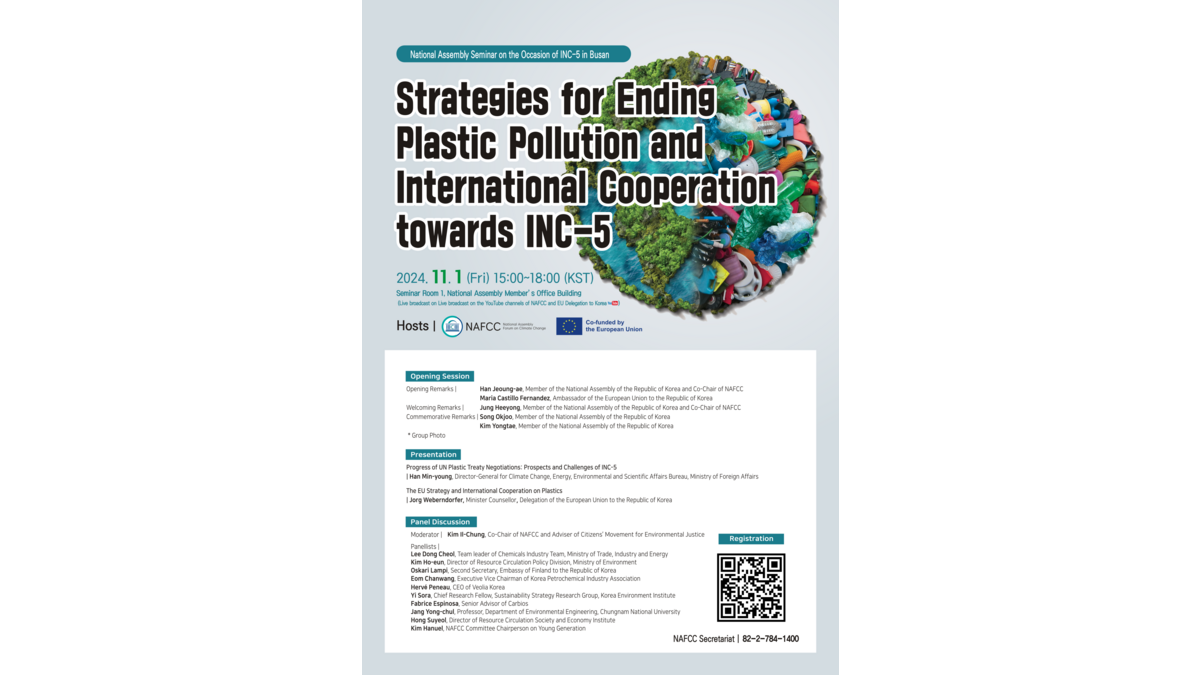 The National Assembly Forum on Climate Change (NAFCC) and the Delegation of the European Union to the Republic of Korea, in the framework of the EU-RoK Green Partnership, will jointly hold a seminar on 'Strategies for Ending Plastic Pollution and International Cooperation' on Friday, November 1st 2024, ahead of the 5th Intergovernmental Negotiating Committee (INC-5) to finalise the UN international agreement on plastic pollution, which will be held in Busan at the end of November. The seminar aims to discuss strategies to end global plastic pollution and to promote international cooperation, converging with global efforts to establish a legally binding international treaty.