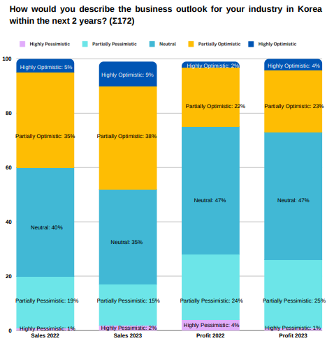 When it comes to the business outlook for the companies in their respective sectors in Korea over the next two years, the data presents a mixed picture: 47% responded neutrally, while 27% answered positively, and 26% expressed a negative outlook. In the survey results from 2022, the respective figures were 24% and 28%.