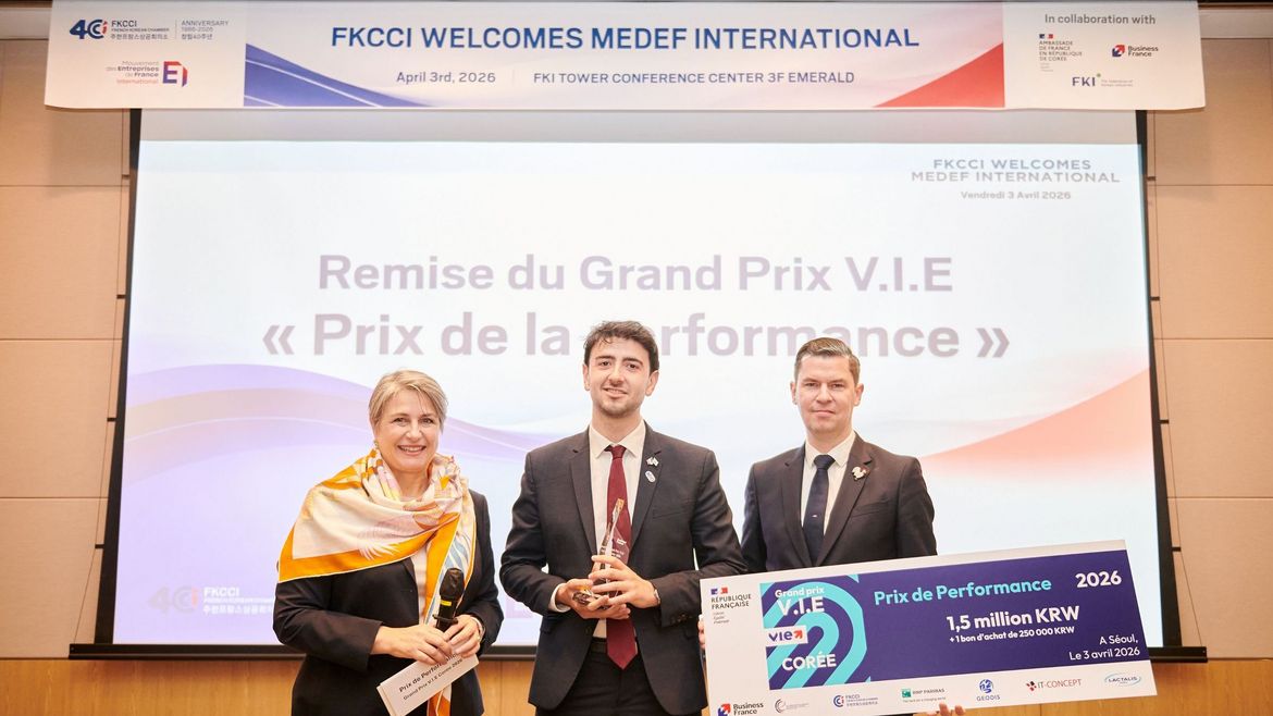 On April 3, the French Korean Chamber of Commerce and Industry (FKCCI), in partnership with Business France and the Embassy of France in the Republic of Korea, held the Grand Prix V.I.E 2026 ceremony in Seoul, as part of the high-level event organized with MEDEF International, recognizing the outstanding achievements of young professionals contributing to the international development of French companies in Korea.