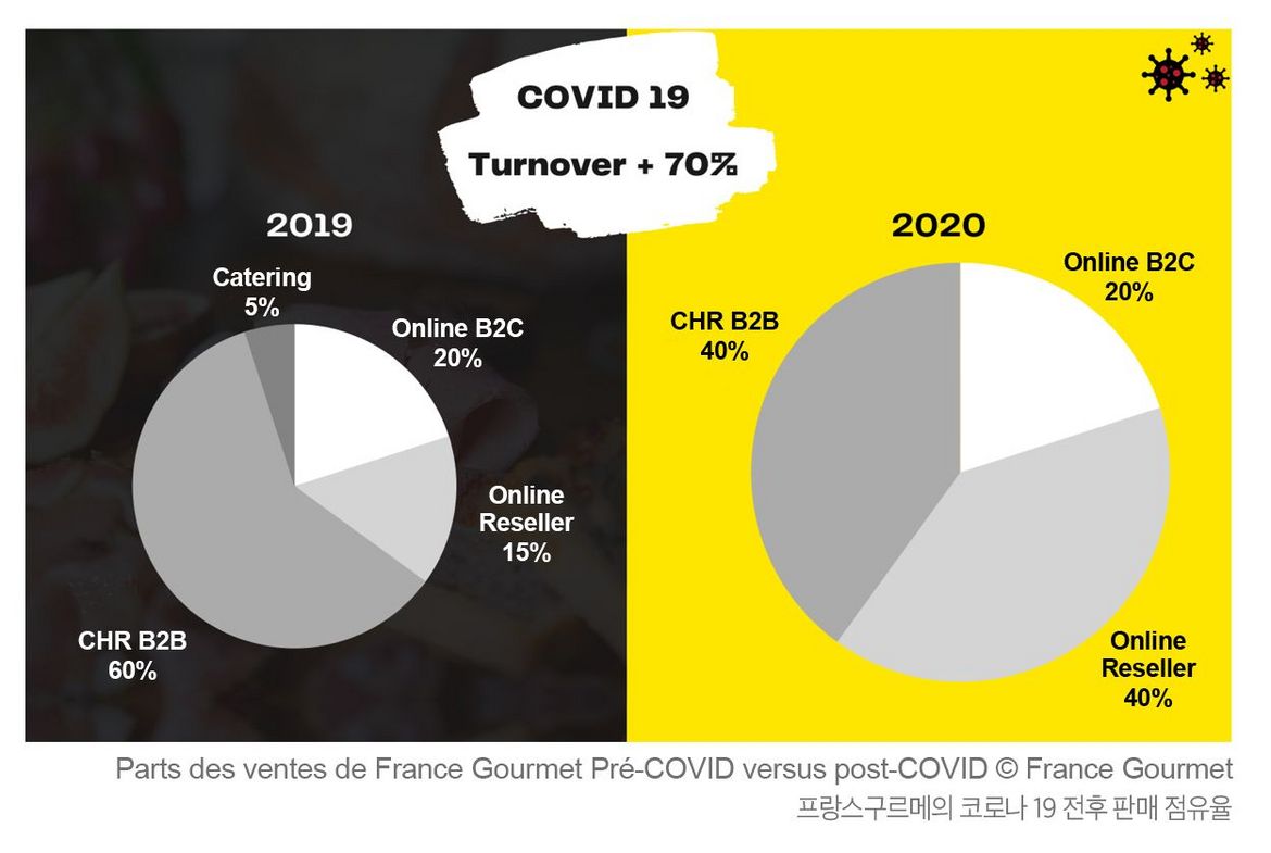 Avec la pandémie, le recentrage des consommateurs sur la satisfaction des besoins fondamentaux comme la nourriture en livraison à domicile a entrainé une hausse de 66% des ventes en ligne du secteur F&B. Cela a renforcé le leadership des grands acteurs préexistants, comme Coupang, Market Kurly, Naver, Gmarket, et l’apparition de centres de logistique et de distribution de plus en plus de gigantesques. La livraison de plats préparés a elle aussi explosé de 109% avec des applications comme Yogiyo, Coupang Eat ou Baemin, forçant les restaurants à développer une offre à emporter.