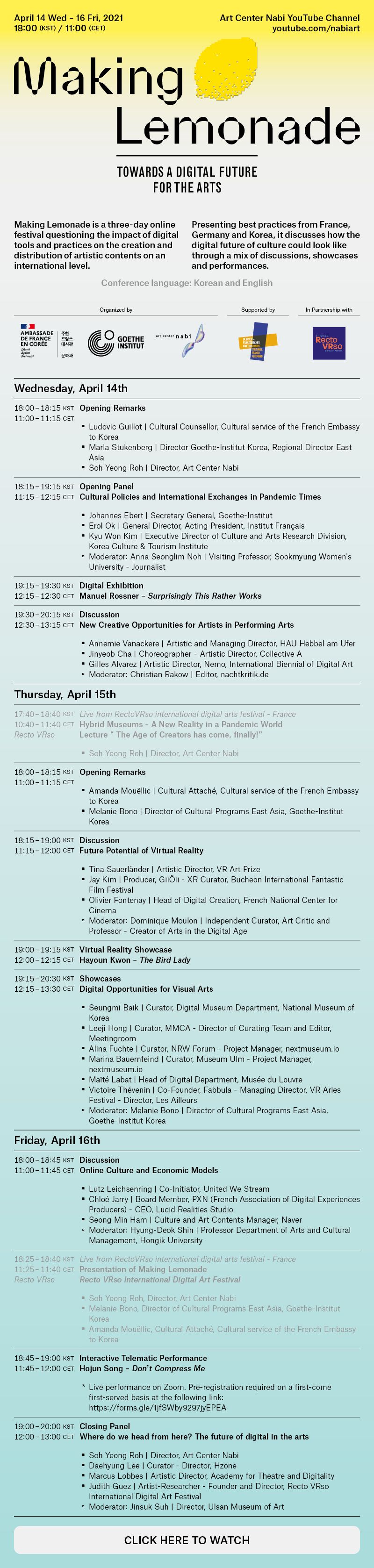 The Cultural service of the French Embassy to Korea, Goethe-Institut Korea and Art Center Nabi are co-organizing an online symposium entitled “Making Lemonade”, in order to open the debate on the future of culture and the arts, and the impact of digital tools and practices on the creation and distribution of artistic contents, in the context of the continuing global pandemic. The aim of this conference is to showcase successful projects organized online or using digital tools, and to discuss the future of these initiatives with speakers, showcases and online performances. The conference will be held over three days, from Wednesday April 14 to Friday April 16.