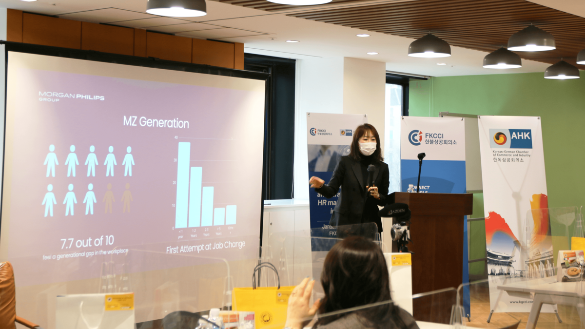New challenges in HR management include a new way of looking at the Employer-Employee relationships, new expectations from employees, in particular for work life balance, generational gap, flexible work time, new project management methods, innovative workspace design, and rapid digitalization. Ms. Christina AHN has especially highlighted the fact that 7.7 out of 10 MZ Generation employees feel a generational gap in the workplace. Their first attempt at job change is within less than 1 year and their reasons for leaving include compensation, opportunity for development, and no learning opportunities.