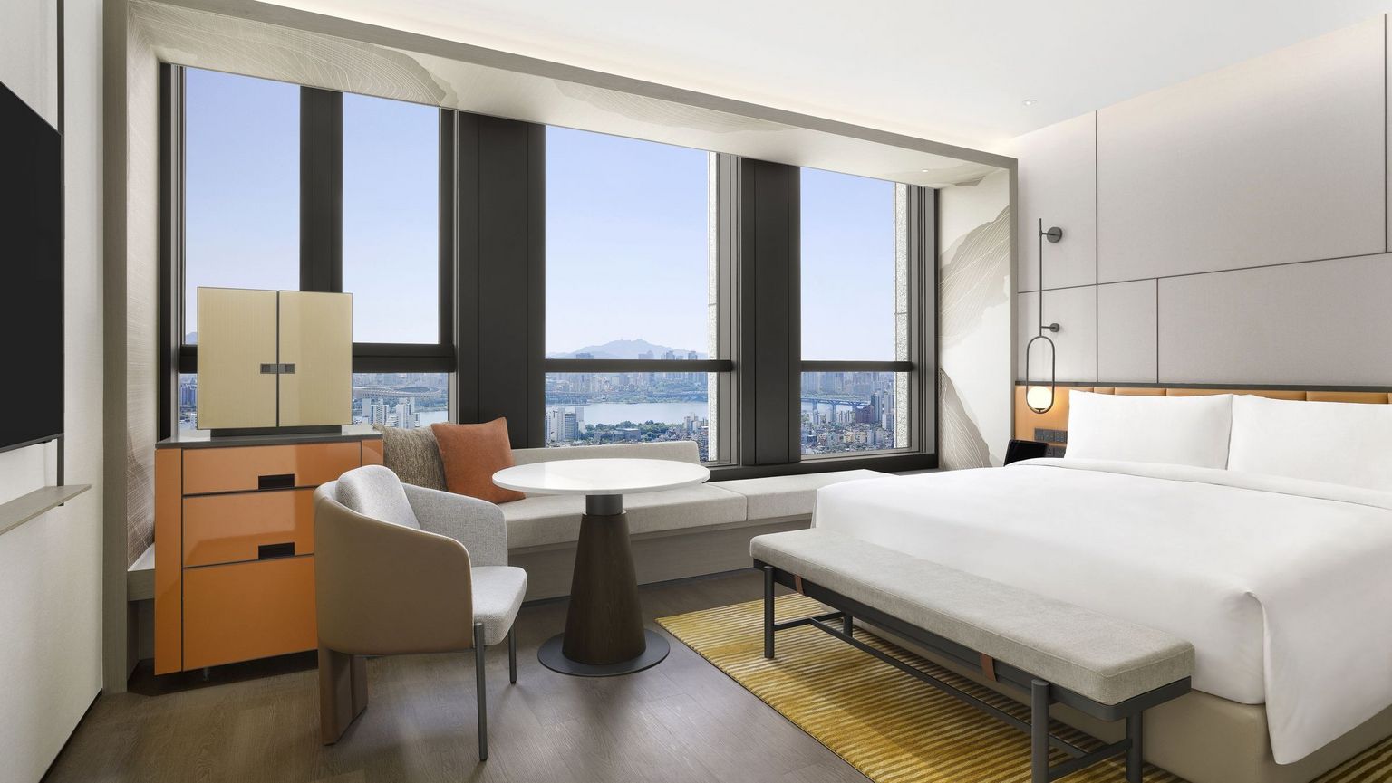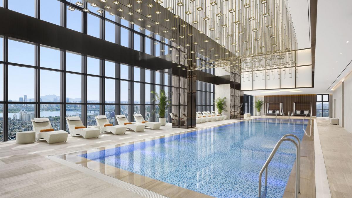 The hotel features 150 contemporary rooms and serviced residences, panoramic views of the Han River and Acha Mountain, wellness facilities including an indoor pool, fitness center, and dedicated event spaces designed for MICE.
