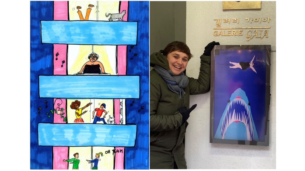 Maggie de Montmartre has held numerous installation projects, such as Le Collectif 18 (Paris, 2020), IME Centre Robert Doisneau (Paris, 2019) and now the streets of Montmartre (2019) as an ongoing street art project. The character is very well loved by its locals, hosting its first exhibitions in bars (Café Burq, January 2019) and offices. (Ad’hoc Presse Agence RP, April 2019) Maggie de Montmartre is currently featured in a Montmartre local quarterly magazine Montmartre à la Une in a permanent column. Following its successful first exhibition in January 2020, the second Seoul exhibition will be presenting the never-ending expanded world of the character, featuring the “COVID-19” series produced during the Parisian lockdown (“confinement” in French) from March to May 2020, with the “Kung-Fu” series which portray the artist’s meditative purpose and her passion for sports. The exhibition will also include a selection of Maggie de Montmartre’s core digital drawing series and a selection of posters and storyboards, as well as a package of sketches of current ongoing series and future projects to come. From December 1st to January 18th, Maggie de Montmartre will be featured in digital screen ads in commercial hotspots of Seoul: Gwanghwamun, Jongro, Dongdaemun, Itaewon and Gangnam.