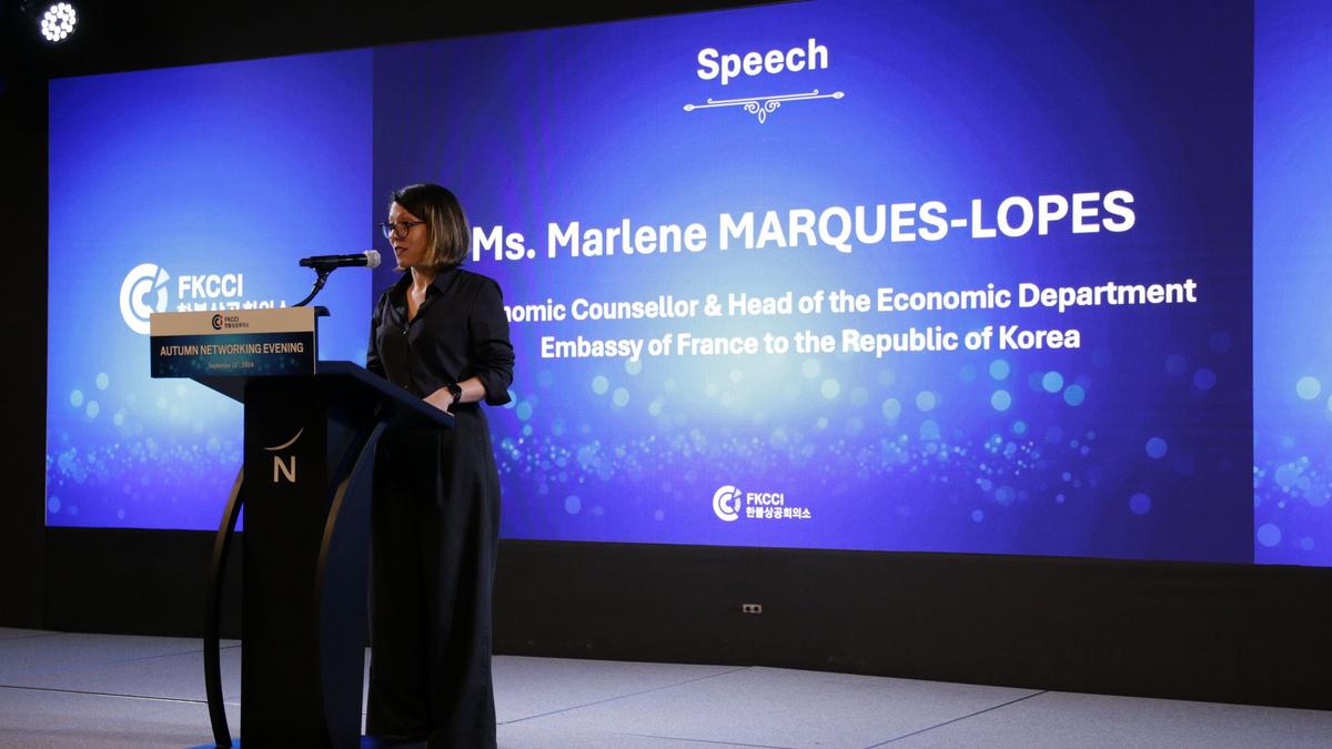 Then, for the first time, the event welcomed Mrs. Marlene Marques Lopes, the new Economic Counsellor and Head of the Economic Department at the Embassy of France to the Republic of Korea, to the stage. In her remarks, she highlighted key events from the past few months, including the Bastille Day celebration, which, for the first time, was co-organized by the French Embassy and the FKCCI and attracted a record number of attendees. Mrs. Marques Lopes also expressed her enthusiasm for the upcoming fall business season and shared her anticipation for future events that will further engage the French community in South Korea.