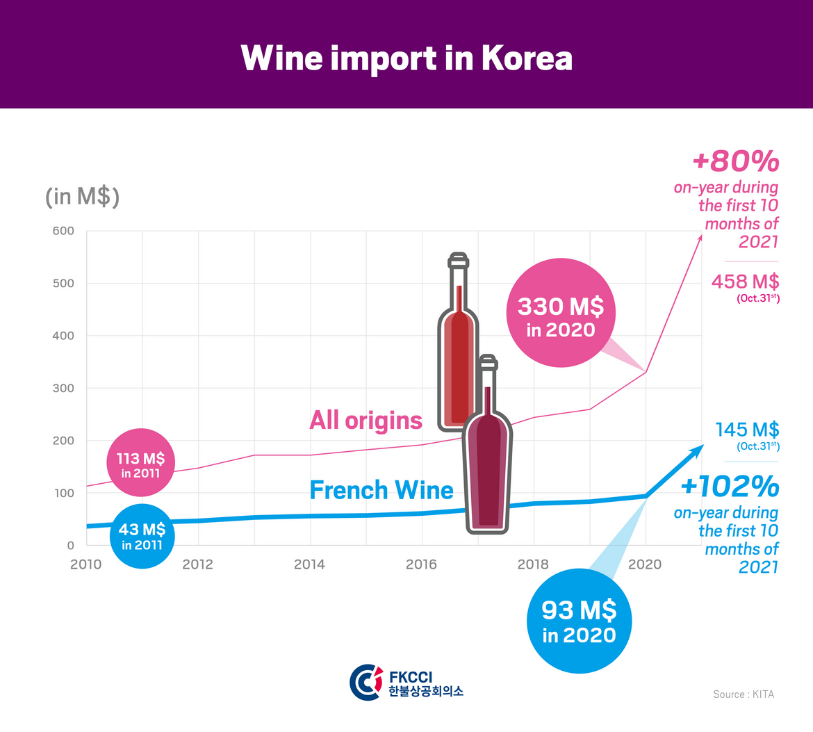 While still a niche, the wine market is rapidly growing especially in the young population. Since 2011, the wine import in Korea is on a constantly growing trend with 113M$ of wine imports from all origins. Additionally, since 2020, the market has skyrocketed from 330M$ in 2020 to +80% by October 2021 year-on-year reaching an all-time-high of 458M$ for wines of all origins. The trend for French wines is even higher growing from 43M$ in 2011 to 93M$ in 2020 and 145M$ by October 2021 (+102% y-o-y).