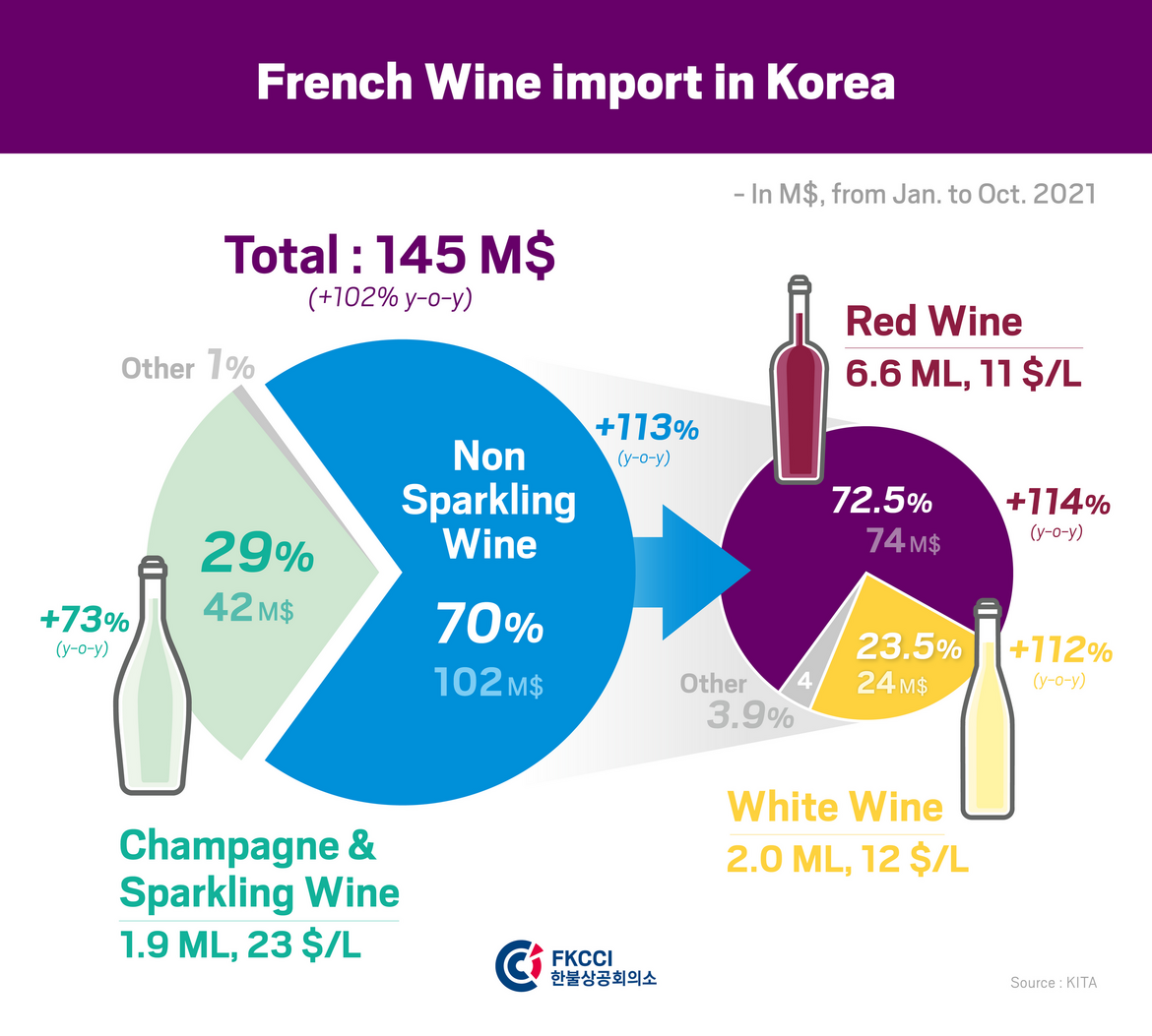 Out of this total of 145M$, two trends stand out. Non-sparkling wines represent 70% of the market share of French wines in Korea with a total of 102M$ (+113% y-o-y) while Champagne and sparkling wines represent 29% with 42M$ (+73% y-o-y) and 1.9M litres imported between January and October 2021 at an average of 23$ per litre. Among non-sparkling wines, red wines represent 72% of the market share with 74M$ (+114% y-o-y) and 6.6M litres imported at an average of 11$ per litre, while white wines account for 123,5% with 24M$ (+112% y-o-y) and 2M litres imported at an average of 12$ per litre.