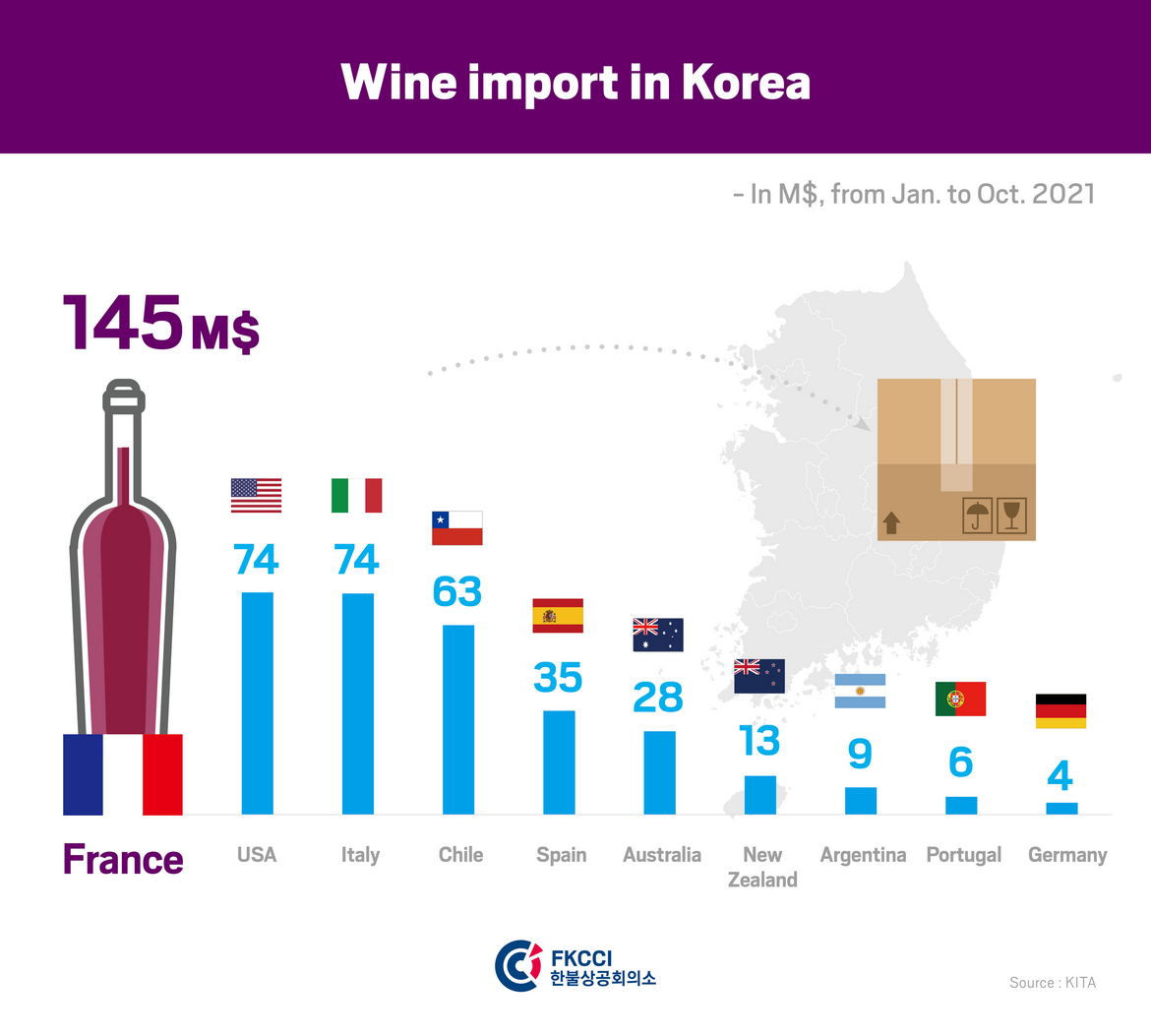With 145M$ in October 2021, French wines represent the #1 origin of wine imports in Korea, far ahead of the US and Italian wines with 74M$ each, Chile wines with 63M$ and Spanish wines with 35M$.