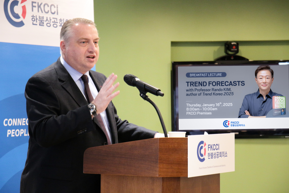 On Thursday, January 16th, 2025, the French Korean Chamber of Commerce and Industry (FKCCI) successfully hosted its first event of the year, a breakfast lecture featuring renowned professor Rando Kim. Known for his expertise in consumer trends and his bestseller Trend Korea 2025, Professor Kim provided attendees with valuable insights into the opportunities and challenges shaping the year ahead.