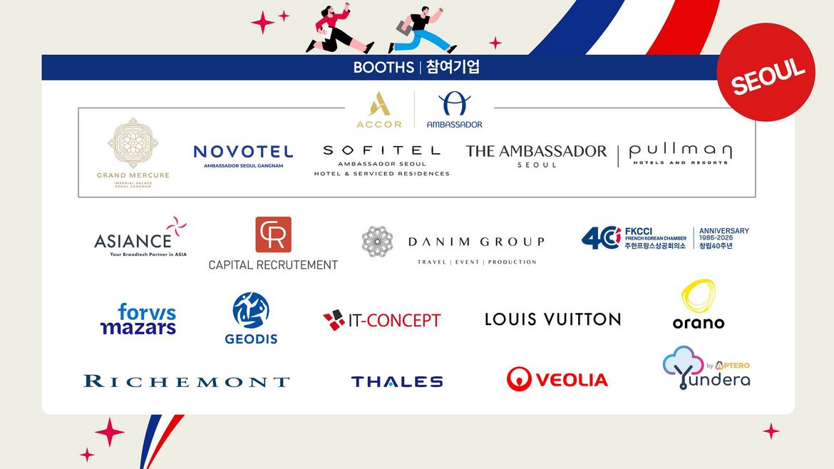A selection of French, Korean, and international companies will be present throughout the day with dedicated booths, offering direct access to their teams and current opportunities. From major groups to innovative SMEs, these organizations reflect the diversity and dynamism of the French-Korean business community.
