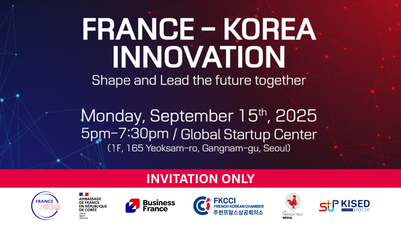 The FKCCI, alongside Business France, the French Foreign Trade Advisors (CCE), the Embassy of France in Korea, and French Tech Seoul, is pleased to invite you to the high-level forum France - Korea Innovation : Shape and lead the future together, taking place on Monday, September 15, 2025, from 17:00 to 19:30 KST at the Seoul Global Startup Center.