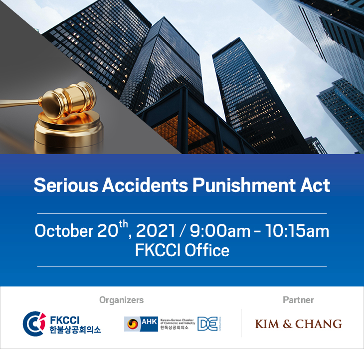 The French-Korean Chamber of Commerce and Industry (FKCCI) and the Korean-German Chamber of Commerce and Industry (KGCCI) have joined together to present the new regulation resulting from the Serious Accidents Punishment Act (SAPA). On October 20, 2021, we will be pleased to welcome experts from Kim & Chang to better understand implications for CEO and top management liabilities. After an introduction by both chambers based on concerns raised by this Act, KIM & CHANG's experts will discuss the following, among other things, at this seminar: