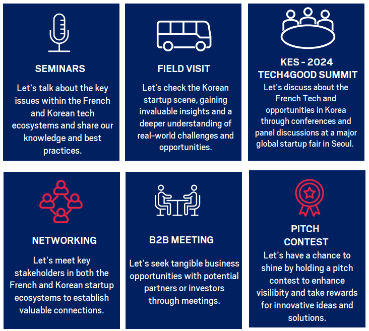 Over 10 French startups will visit Korea to establish direct connections with local stakeholders such as startups, investors and accelerators. Additionally, they will meet with representatives from the French Tech communities in the Asia-Pacific region to foster collaboration and promote both the French and Korean Tech ecosystems as international, open and attractive hubs. The selection of French startups for this program will be made through a call for applications.