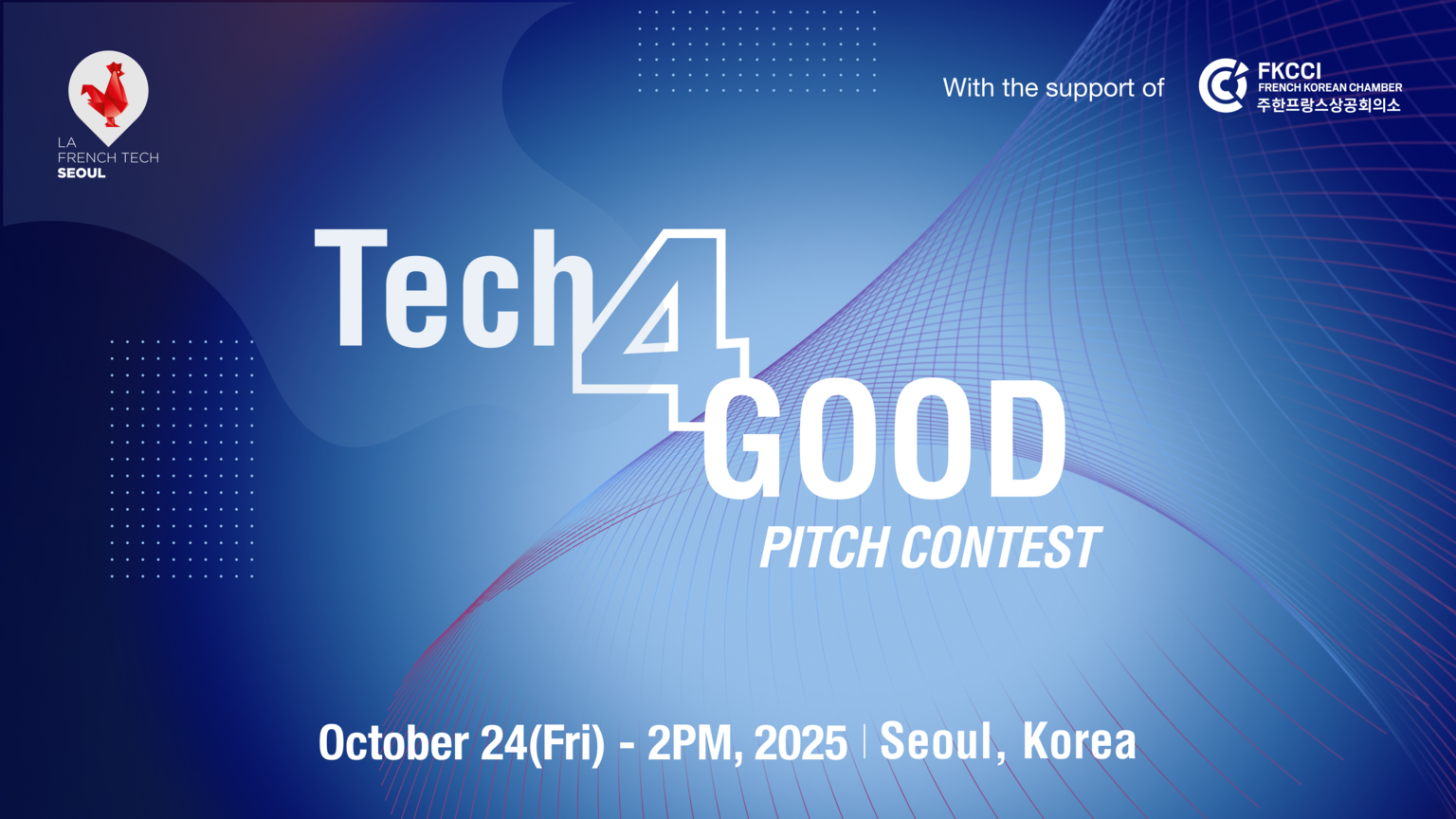 As part of KES 2025, the French Tech Seoul, in collaboration with French-Korean Chamber of Commerce and Industry (FKCCI), is proud to organize the Tech for Good Pitch Contest on October 24, 2025, from 2:00 PM to 3:00 PM at COEX, Seoul.