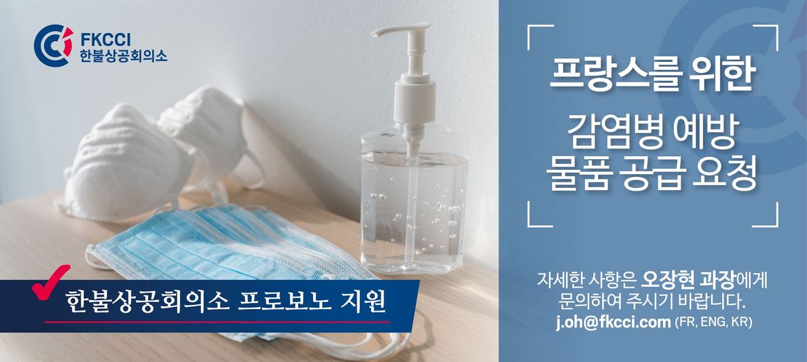 한불상공회의소(FKCCI)는 회원사들의 코로나19 바이러스 감염 예방 노력을 지원하기 위해, 감염 방지 물품 및 진단 키트 제작/공급 관련 국내 기업과의 연결을 지원하고 있습니다. 합니다. 보다 원활환 서비스 지원을 위해 하단의 양식에 답해주시기 바랍니다. 한불상공회의소는 본 중개로 인한 어떠한 이득도 취하지 않습니다.