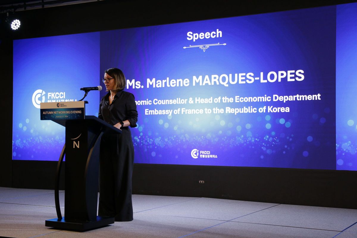 또한, 주한 프랑스 대사관의 새로운 경제통상대표부 대표 마를렌 마르케즈 로페스(Mrs. Marlene Marques Lopes)는 최근 몇 달간의 주요 행사와 주한 프랑스 대사관과 FKCCI가 처음으로 공동 주최하여 역대 최대 참석자를 기록한 바스티유 데이(Bastille Day) 축제를 언급하며 연설을 시작했습니다. 마를렌 마르케즈 로페스는 다가오는 가을 비즈니스 시즌에 대한 기대감을 표하며, 앞으로도 한국-프랑스 커뮤니티와의 많은 교류를 기대한다고 전했습니다.
