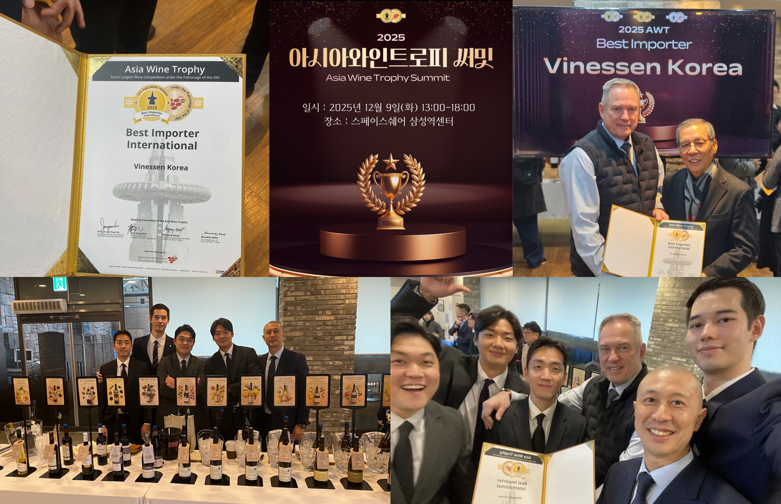 비네센코리아는 2024년에 이어 2025년에도 아시아 와인 트로피에서 ‘최우수 국제 와인 수입사’로 선정되었습니다.
