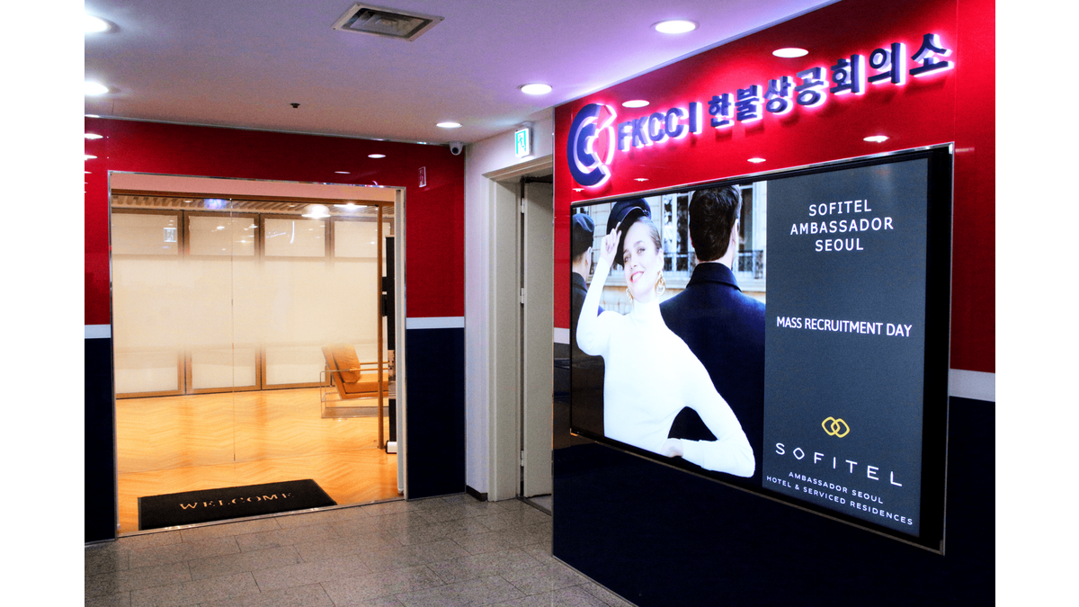 지난 6월, 한불상공회의소는 비즈니스 센터에서 소피텔 앰배서더 서울의 실무자들을 맞이했다. 호텔은 채용 면접을 위한 인터뷰를 진행하고자 한불상공회의소의 이벤트 홀과 미팅룸을 대여했다. 소피텔 앰배서더는 아코르 그룹 소속이자 올해 9월 롯데타워 근방에 새로 오픈할 예정이다.