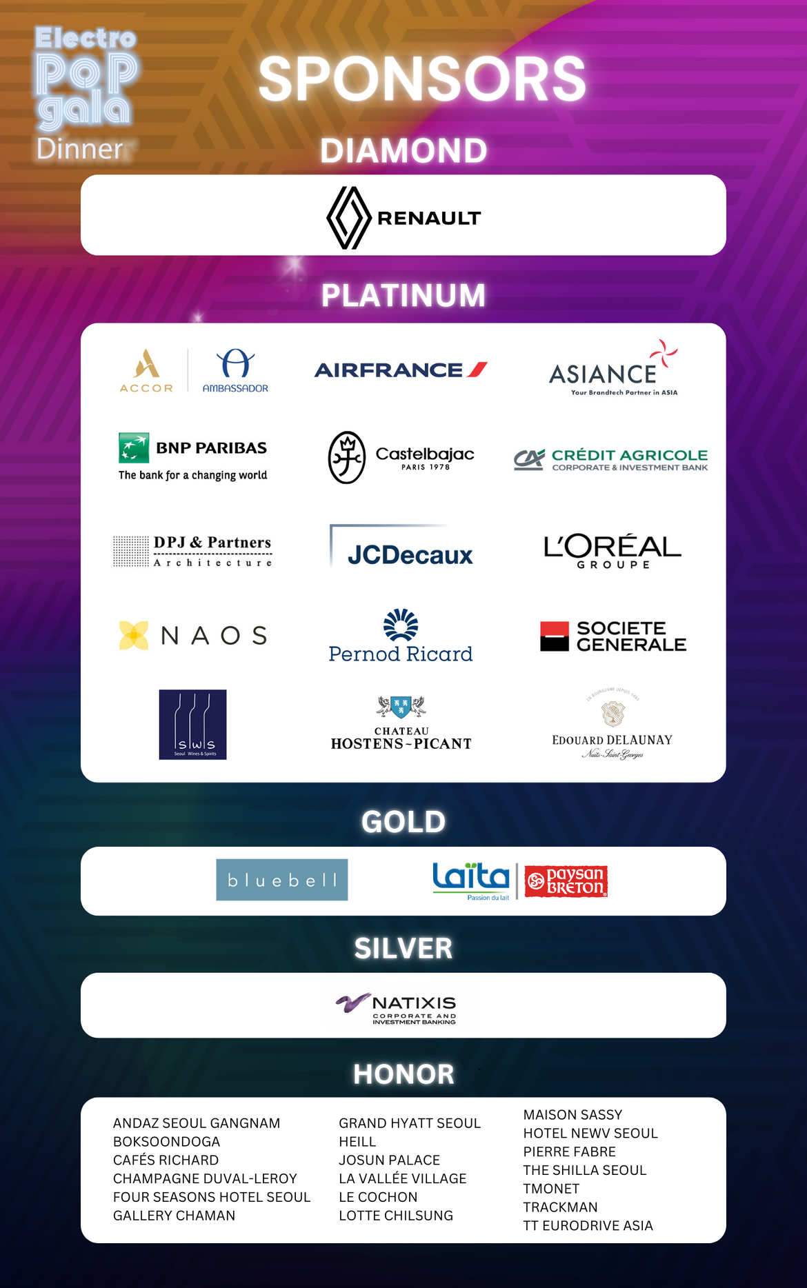 이 저녁은 한불상공회의소 파트너사들의 아낌없는 지원 덕분에 가능했습니다: Renault Korea, Accor Group, Air France, Asiance, BNP Paribas, Castelbajac, Crédit Agricole CIB, DPJ & Partners, JCDecaux, L’Oréal Korea, Naos, Pernod Ricard, Société Générale, Seoul Wines & Spirits, Bluebell, Laita, Natixis.