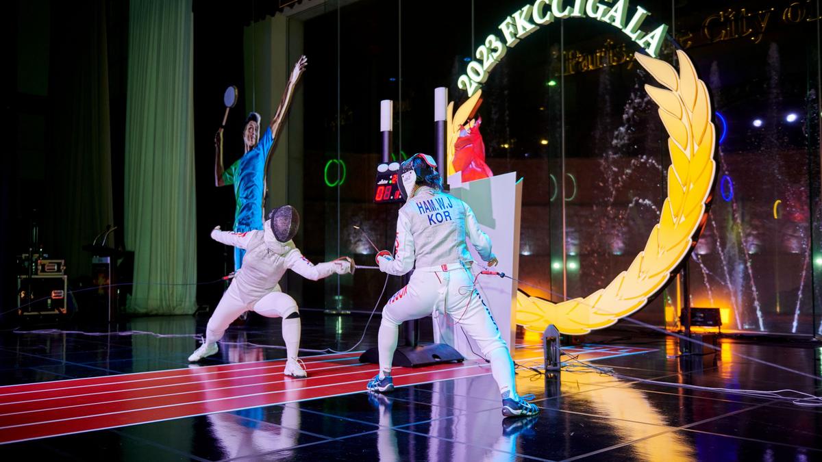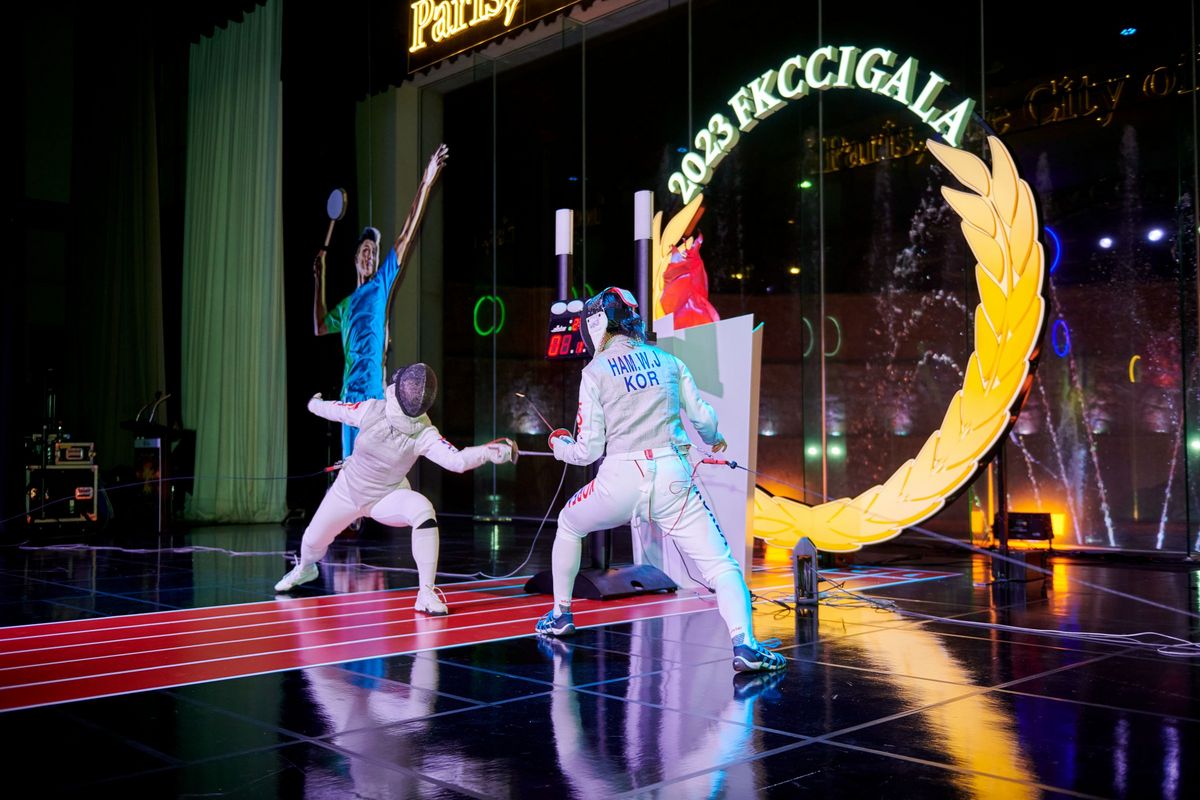 참가자분들은 저녁 내내 디피제이앤파트너스에서 디자인한 아름다운 장식과 다양하고 매혹적인 퍼포먼스를 통해 파리의 우수성과 스포츠 정신에 빠져들 수 있었다. 국제 펜싱 연맹 심판이자 전 한국 대표팀 코치로 활약했던 고종환 코치의 전문적인 지도 아래 떠오르는 두 명의 플뢰레 선수들 간의 펜싱 게임을 선보였으며, 이어서 비보이 크루인 올마이티후즈가 무대에 올라 2024년 파리 올림픽에 새롭게 추가될 네 가지 종목 중 하나인 브레이크댄스를 소개하며 화려한 공연을 선보였다.