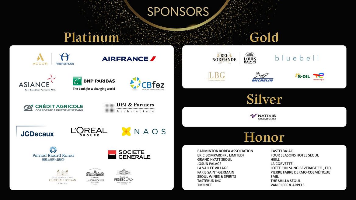 국내 주요 한불 기업 30여 곳에서 한불 비즈니스 커뮤니티의 특별한 저녁을 위해 한불상공회의소의 파트너로서 참여했다. : 아코르 그룹, 에어프랑스, 아지앙스, BNP 파리바, 충북경제자유구역청, 크레디아그리콜 CIB, 디피제이앤파트너스, 제이씨데코, 로레알 코리아, 나오스, 페르노리카 코리아, 소시에떼 제네랄, 샤또 디쌍, 샤또 라퐁로쉐, 샤또 페데스클로, 벨 노르망드, 부루벨 코리아, 럭셔리비즈니스그룹LBG), 미쉐린, 에쓰-오일토탈에너지윤활유, Natixis 등이 후원사로 한불상공회의소와 함께 했습니다.