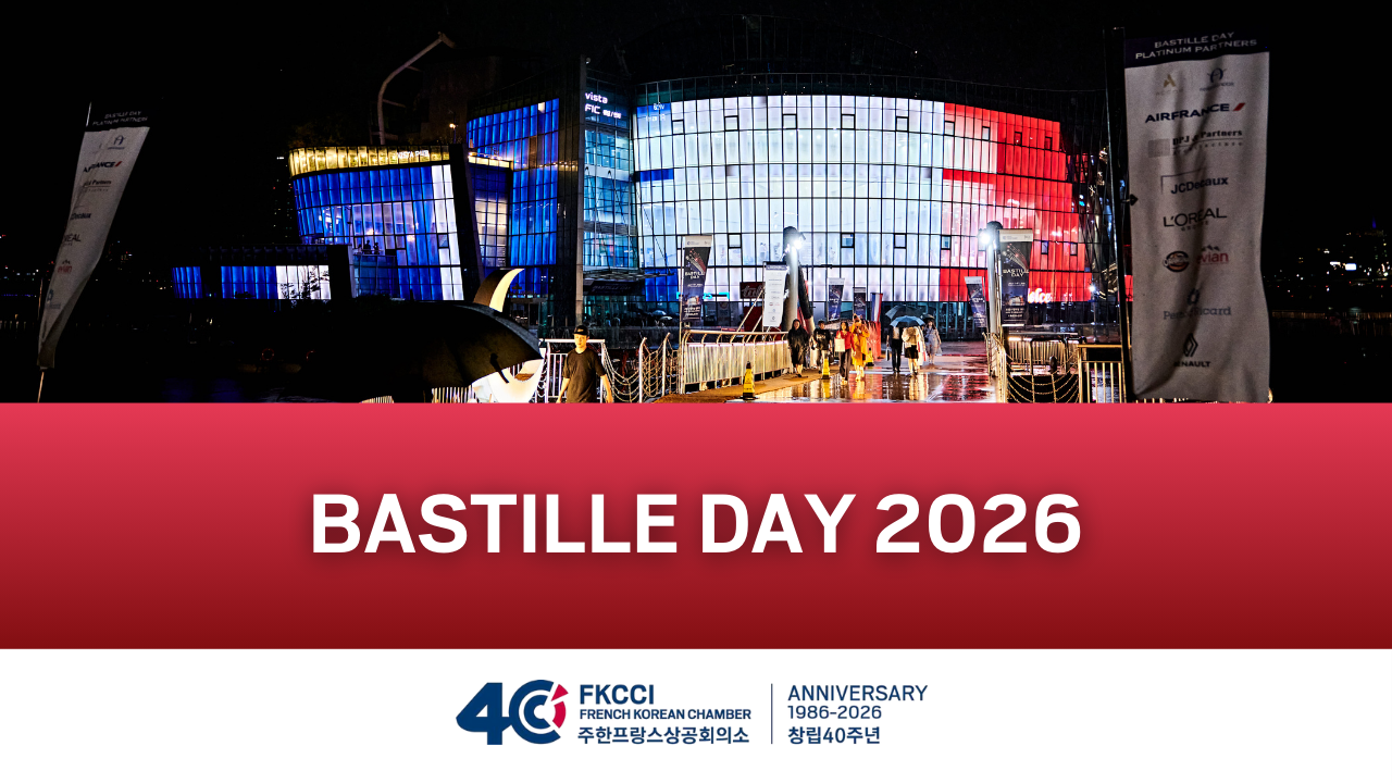 7월 14일, 주한프랑스상공회의소(FKCCI)는 한불 양국 커뮤니티를 다시 한자리에 모아 바스티유 데이 2026을 기념합니다. 본 행사는 매년 FKCCI 연간 일정 중에서도 가장 기대를 모으는 대표적인 행사 중 하나입니다.