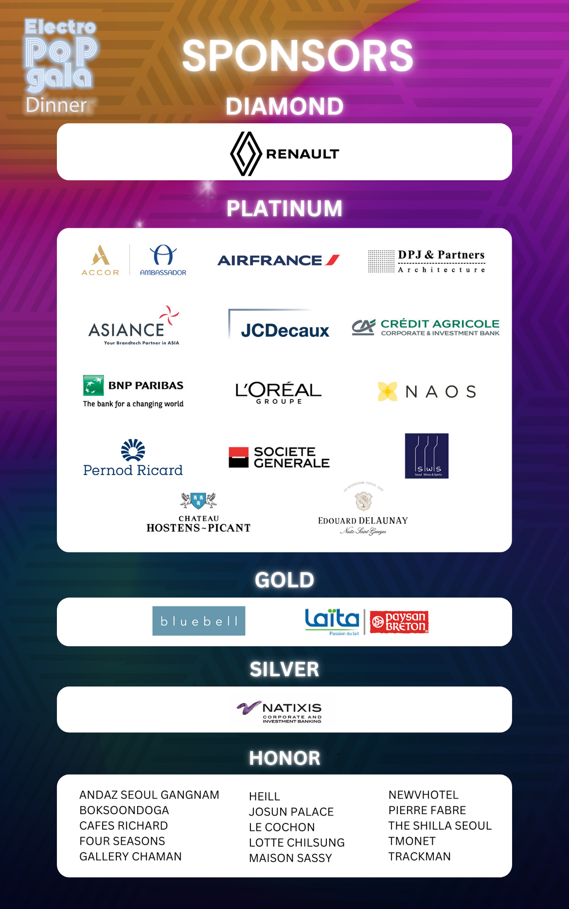 800여명의 귀빈이 참석하는 한불상공회의소 갈라는 테이블 예약을 통해 귀사의 고객과 파트너들을 갈라 디너 행사에 초청하여 잊지 못할 저녁을 선사하고, 한불비즈니스 커뮤니티의 대표 연례행사에 파트너사가 되어 귀사의 브랜드를 홍보할 수 있는 최고의 기회입니다.