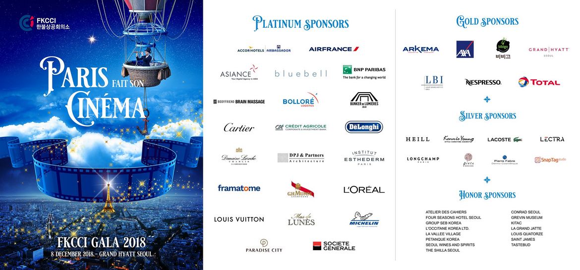 제 29회 한불상공회의소 갈라디너 행사는 "파리와 영화"를 주제로 2018년 12월 8일 토요일 그랜드 하얏트 서울 그랜드볼룸에서 개최되었습니다.
