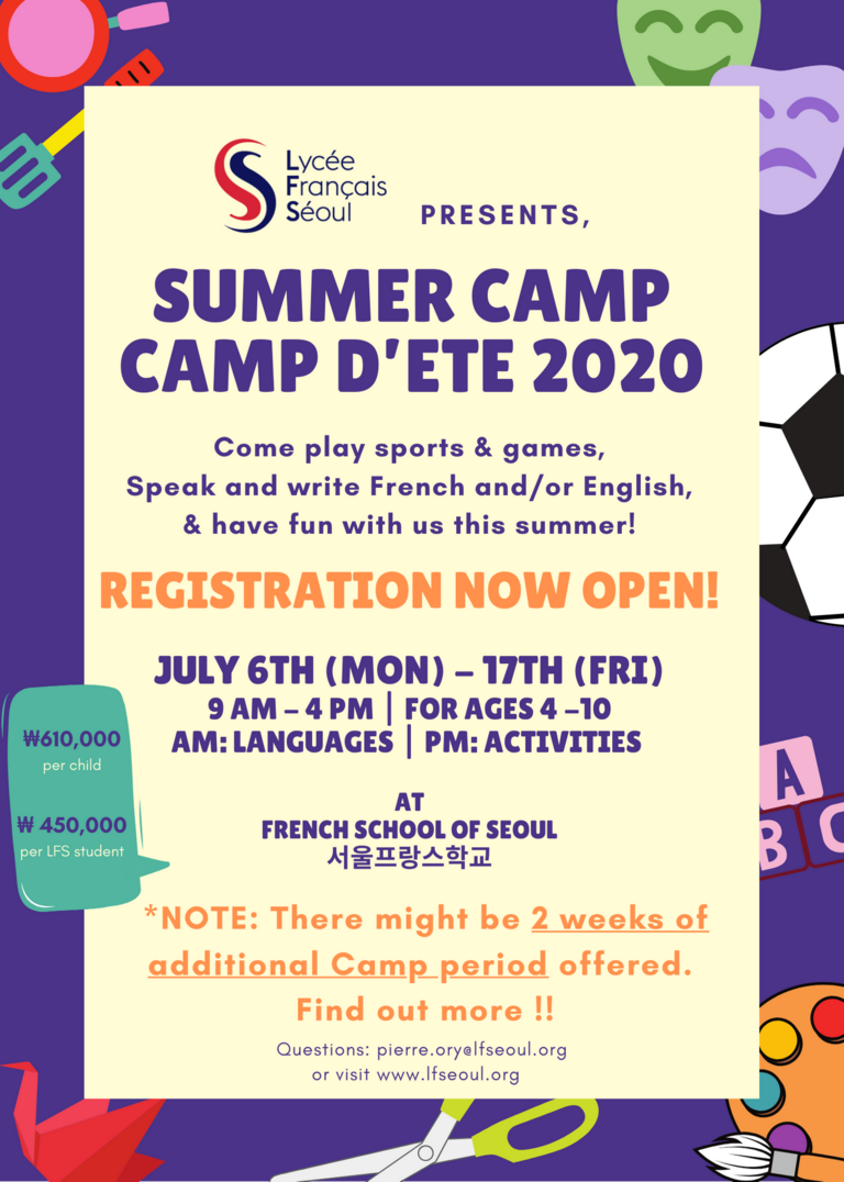 Le Lycée Français de Séoul organise, comme chaque année, son « Camp linguistique estival » de deux semaines du 6 au 17 juillet 2020.