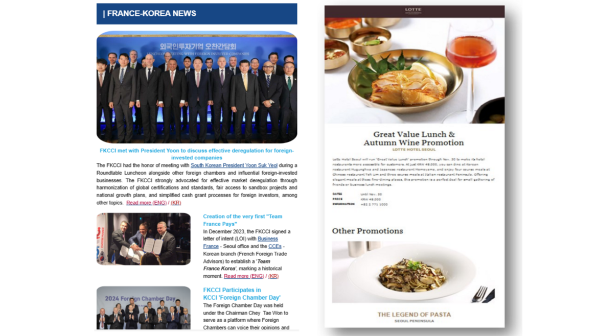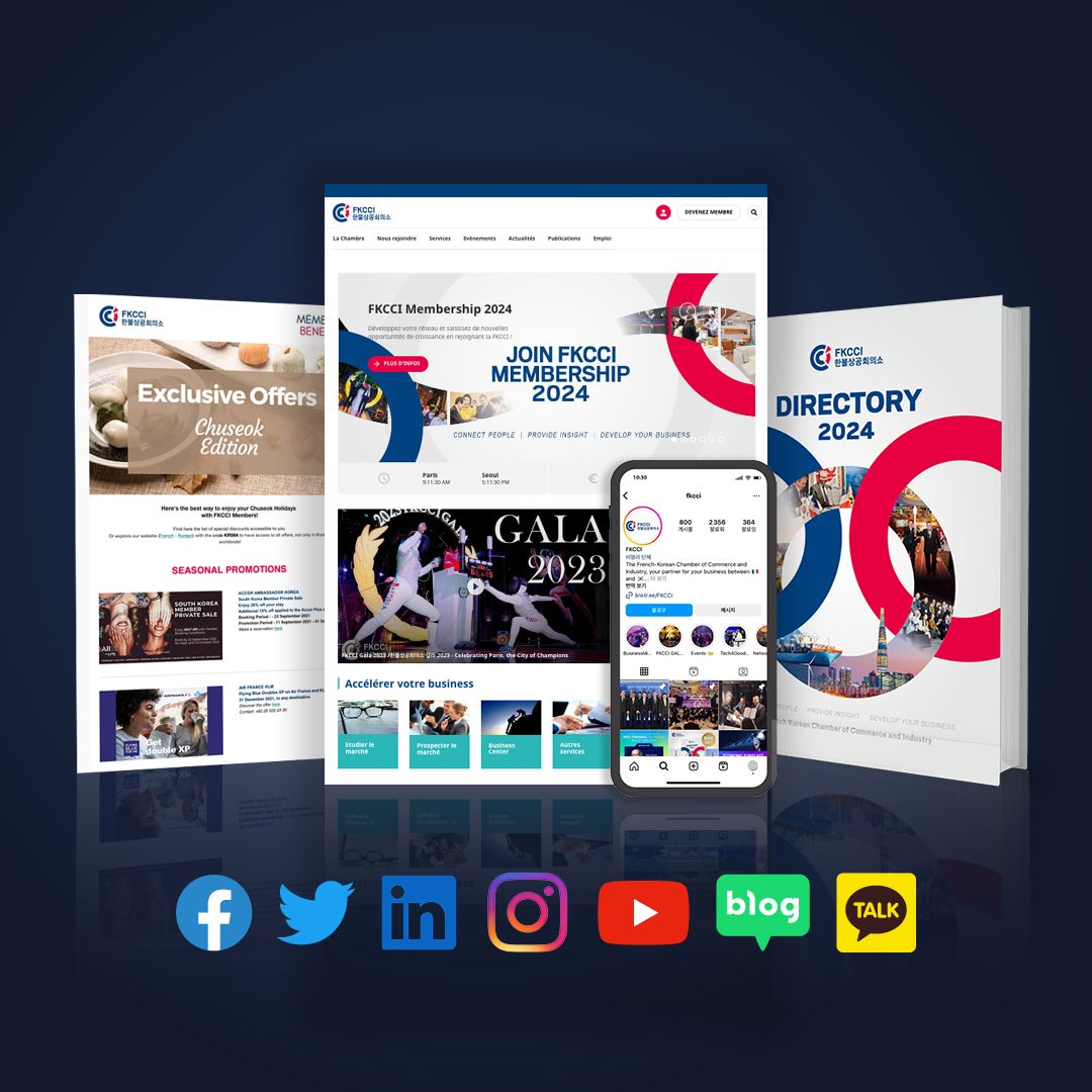 Vous voulez communiquer sur l’un de nos réseaux ou réaliser une campagne customisée? La FKCCI vous propose diverses plateformes et solutions pour communiquer auprès de la communauté d’affaires franco-coréenne dont plus de 5000 business leader ! Publicités, articles promotionnels, e-mailing... Grâce à notre équipe biculturelle et notre réseau de partenaires (agenges digitales, presse, design,...), nous pouvons nous occuper de toutes les étapes depuis la création d'une campagne jusqu'à sa diffusion B2B ou B2C.